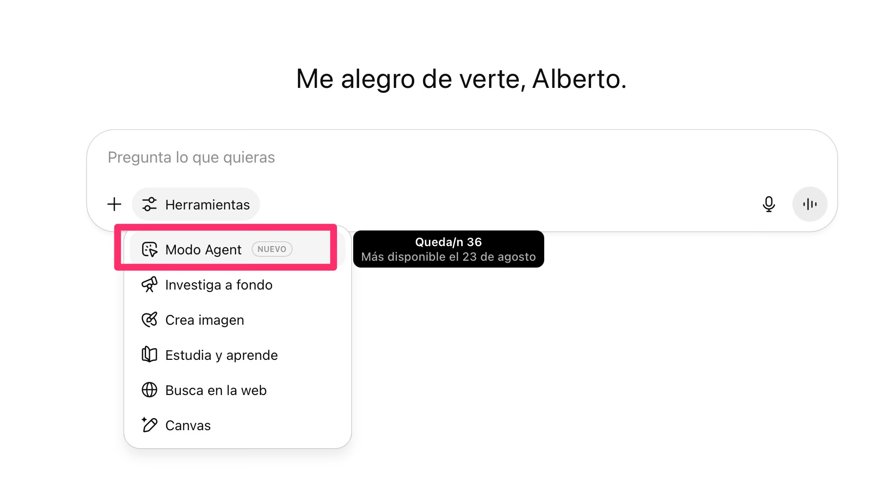 ‼️ Información importante: Las tareas programadas solo están disponibles en planes de pago como ChatGPT Plus o superiores. Para usarlas, debes activar el Modo agente, que explicaré más adelante.