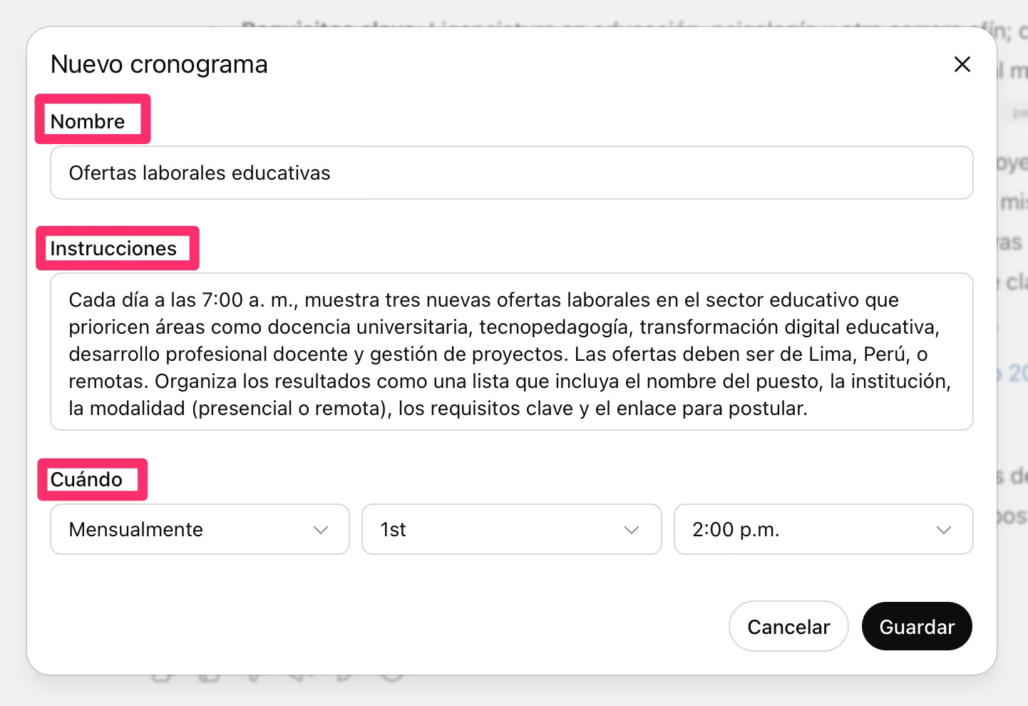 En la ventana emergente verás todos los elementos de la tarea, que acabas de crear, que puede modificar: Nombre, Instrucciones (prompt) y cuándo (frecuencia y hora).